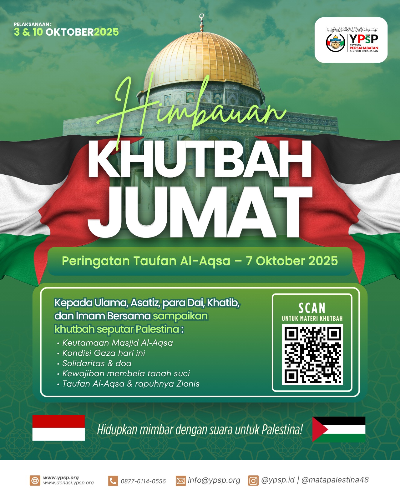 Kami mengimbau agar khutbah pada 3 dan 10 Oktober 2025 difokuskan untuk menyuarakan dukungan, keprihatinan, dan seruan keadilan bagi rakyat Palestina, khususnya mereka yang terdampak di Gaza.